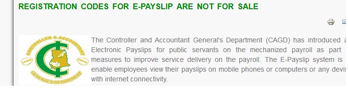 Registration onto the E-Payslip system can only be done using a code to be obtained from heads of department or management Units. CAGD has therefore issued these codes to responsible officers of the Institutions.