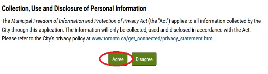 The Municipal Freedom of Information and Protection of Privacy Act (the “Act”) applies to all information collected by the City through this application. The information will only be collected, used and disclosed in accordance with the Act. Please refer to the City’s privacy policy at .toronto.ca/get_connected/privacy_statement.htm.