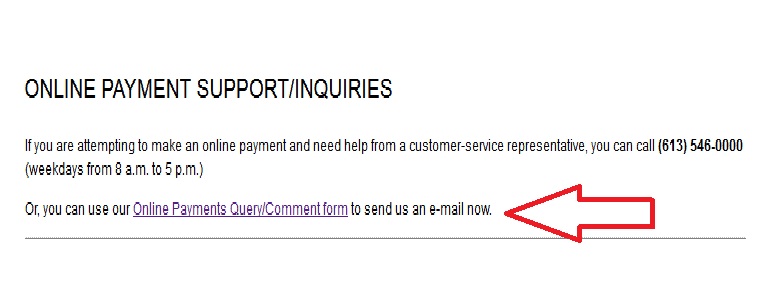 If you are attempting to make an online payment and need help from a customer-service representative, you can call (613) 546-0000 (weekdays from 8 a.m. to 5 p.m.)