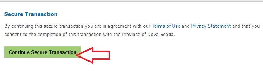 By continuing this secure transaction you are in agreement with our Terms of Use and Privacy Statement and that you consent to the completion of this transaction with the Province of Nova Scotia.