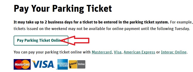 You can pay your parking ticket online with Mastercard, Visa, American Express or Interac Online.