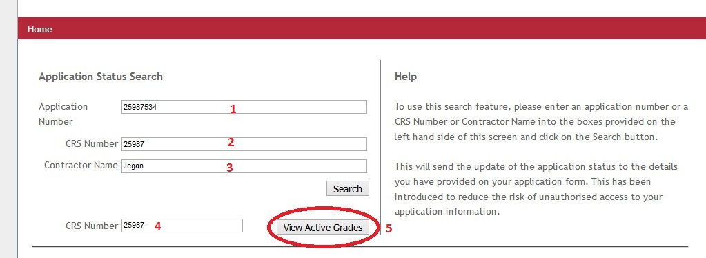 To use this search feature, please enter an application number or a CRS Number or Contractor Name into the boxes provided on the left hand side of this screen and click on the Search button.