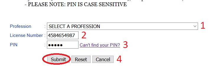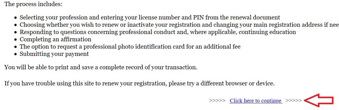 ** Selecting your profession and entering your license number and PIN from the renewal document