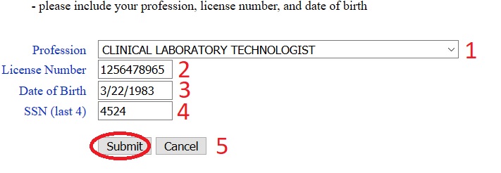When e-mailing, please be sure to include your name, profession, license number, date of birth and the last 4 digits of your social security number. This service is available for licensees in all professions who are in the final 5 months of their current registration period or no more than 4 months past the expiration of their last valid registration period.